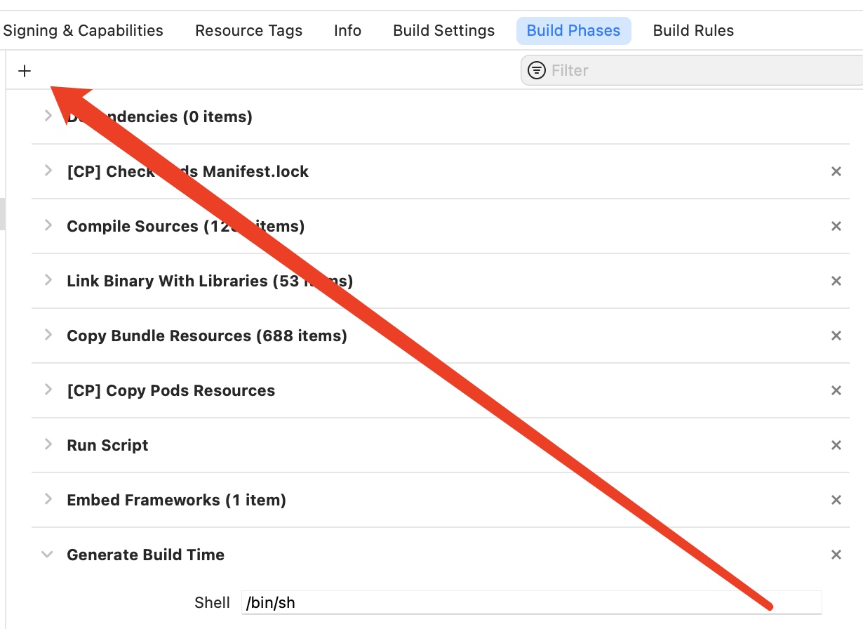 - 在Xcode的Build Phases中点击添加脚本